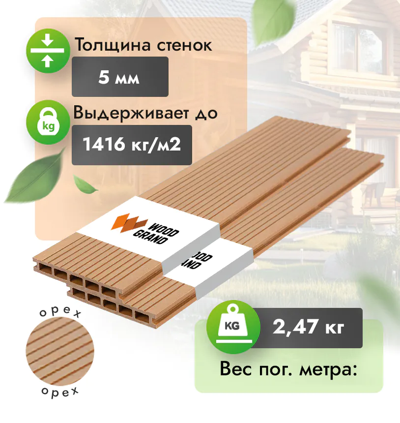 Наша террасная доска из ДПК выдерживает до 3318 кг/м2, влагостойкая, не требует ухода.